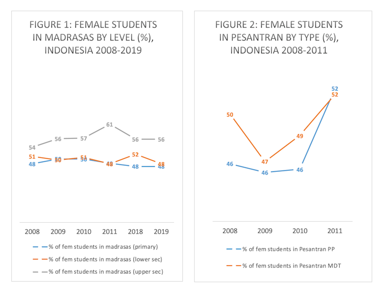 Regardless of the type of Islamic school, female presence has been steady across recent years. (Data from the Indonesian Ministry of Religious Affairs.), Author provided
